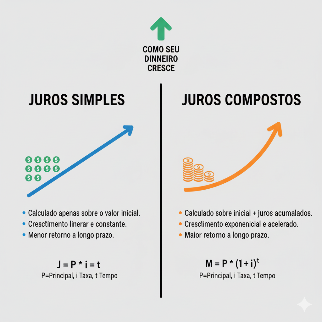 Juros Compostos:  calculados sobre o capital inicial acrescido dos juros já acumulados. Isso faz com que os valores cresçam de maneira exponencial com o passar do tempo.  Em termos práticos, os juros simples seguem uma linha de crescimento linear, enquanto os juros compostos seguem uma linha de crescimento exponencial.